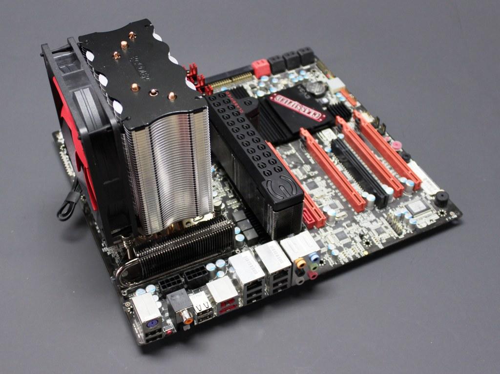 Here we can note that there is ample room for another fan if need be, and also room for the cooler to be configured in a horizontal configuration. We used this orientation so that the air exiting the cooler would provide some cooling benefit to the motherboard cooler.