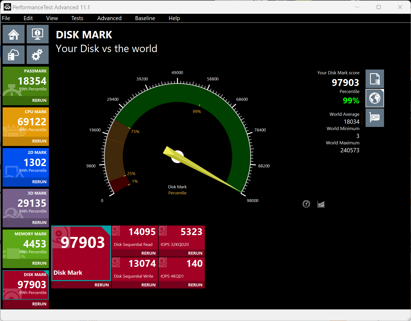 Our PassMark Rating of 18353 is the best we have ever reached in this benchmarks, and apparently, falls in the 99th percentile of all systems tested and scores submitted with this software. This is rather satisfying as a builder and tech reviewer.