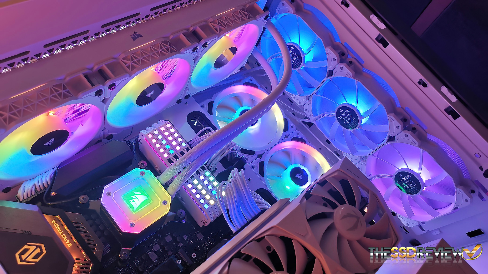 The Corsair white LL120 3 pack are shown against the back wall in this picture and these fans have 48 individually addressable RGB LEDS that are controlled with the included Corsair Lighting Node Pro which enables iCUE to control both fan speed and LEDs. Have we mentioned that the iCUE software also has several pre-programmed LED effects ready to show off all of your iCUE gear?