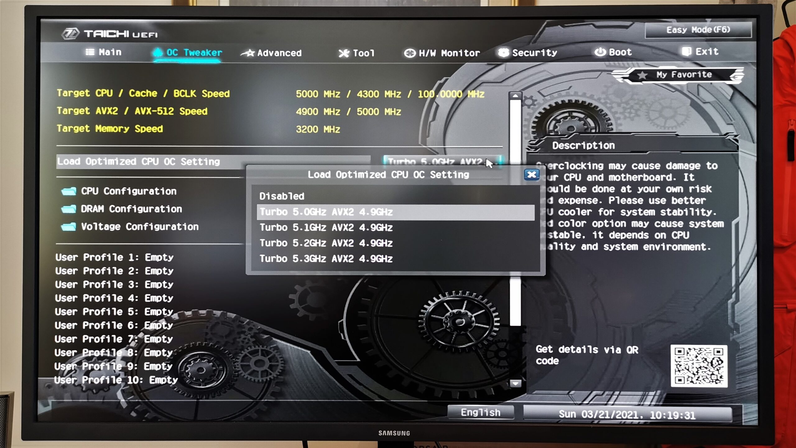 It has Intel Optane Memory support and the only reason that we haven’t even tried to bump it to 5.3GHz is the fact that finally being at 5GHz without any effort whatsoever is comforting. It was no more than a simple click of the ASRock Z490 Taichi UEFI Optimized CPU OC Setting Menu: