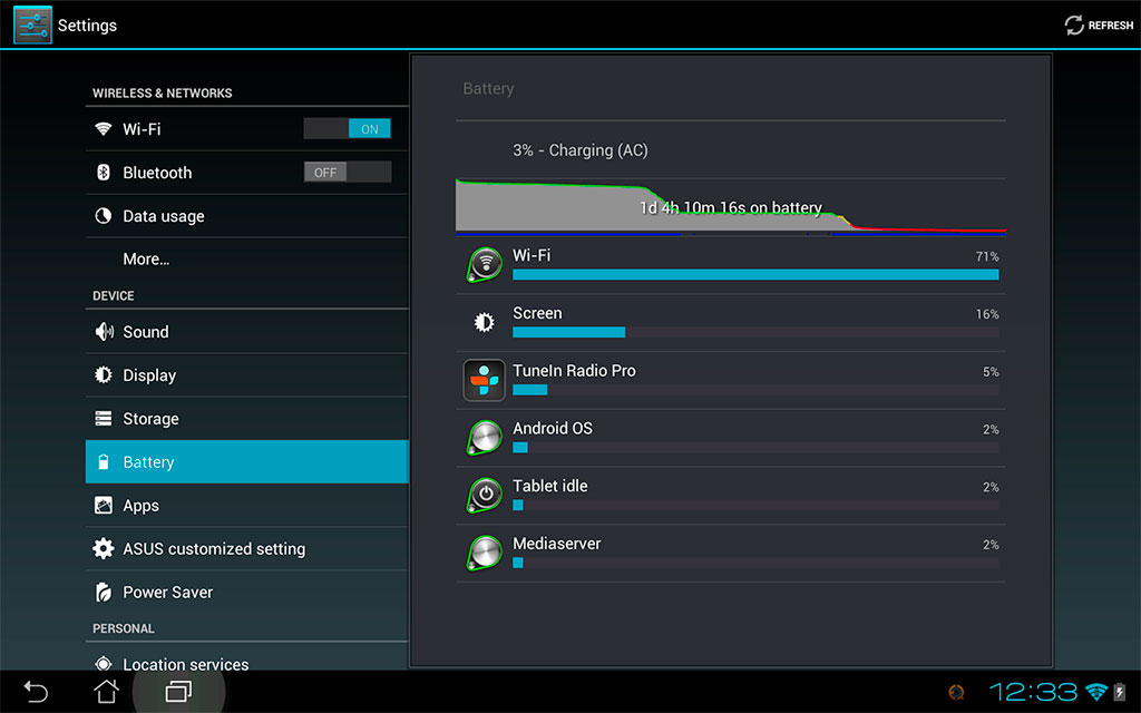 I just miss having 12 hours; These first world problems are killing me! With the addition of Jelly Bean when the device hits 15% power the Infinity automatically goes to power saving. I actually like this feature as it’s easy to bypass and acts as a wake-up to plug-in. From dead the device takes about two and a half hours to charge fully.