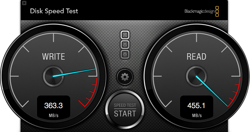 From our Mac world, we found a benchmark program called Disk Speed Test that simply provided the read and write scores of each SSD, the Toshiba being on the left with Samsung on the right.