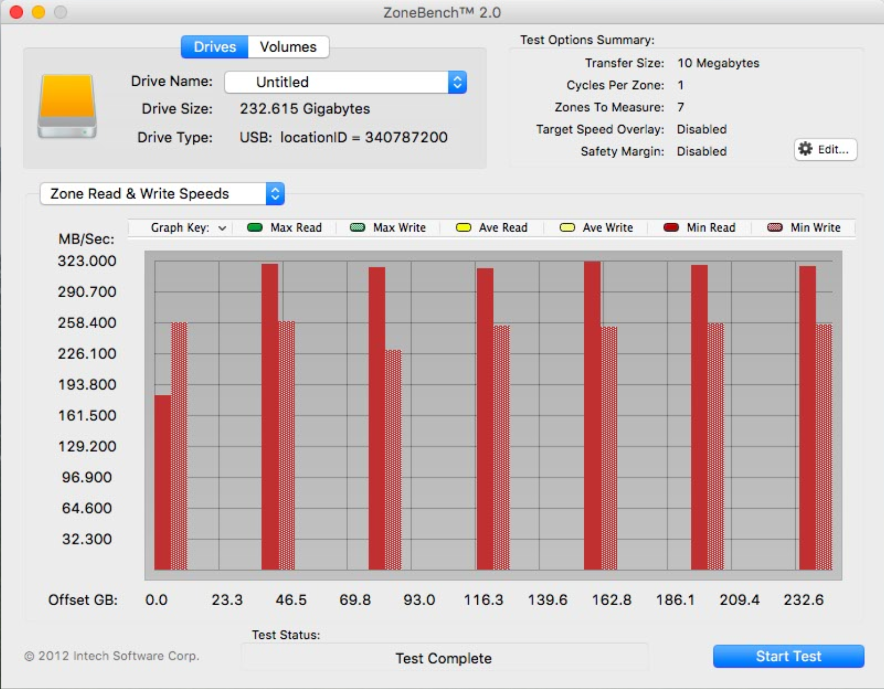 We thought we might test USB 3 speeds of this device and obtained decent highs of 323MB/s read and 258MB/s write as shown here: