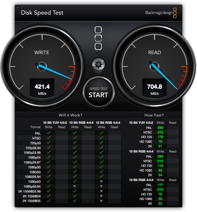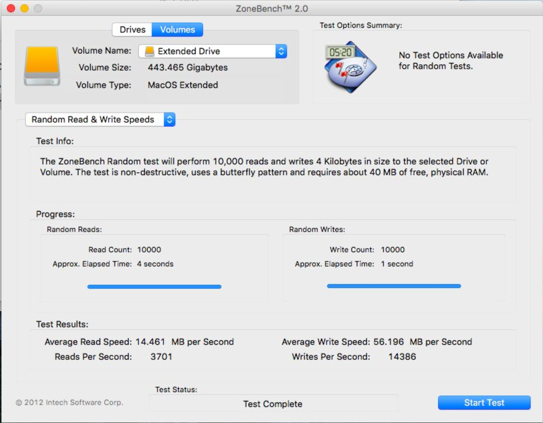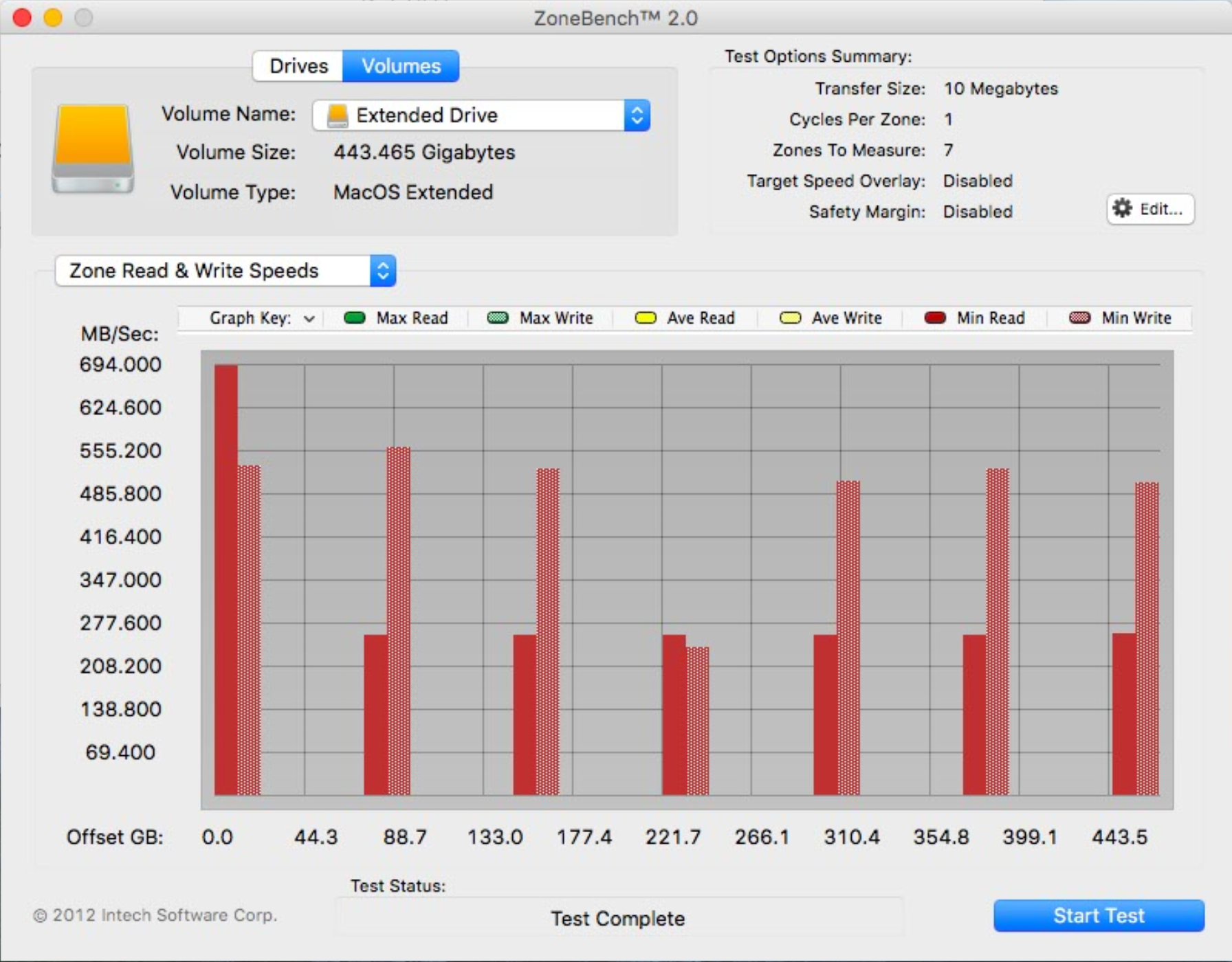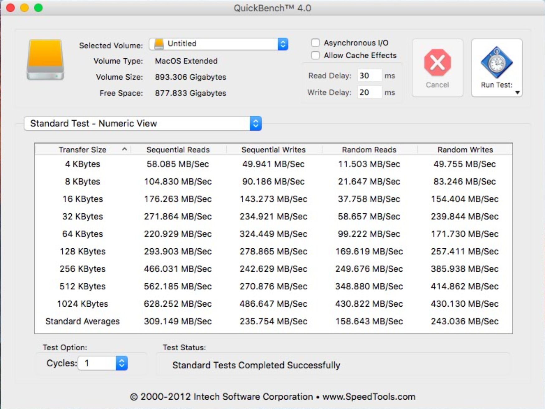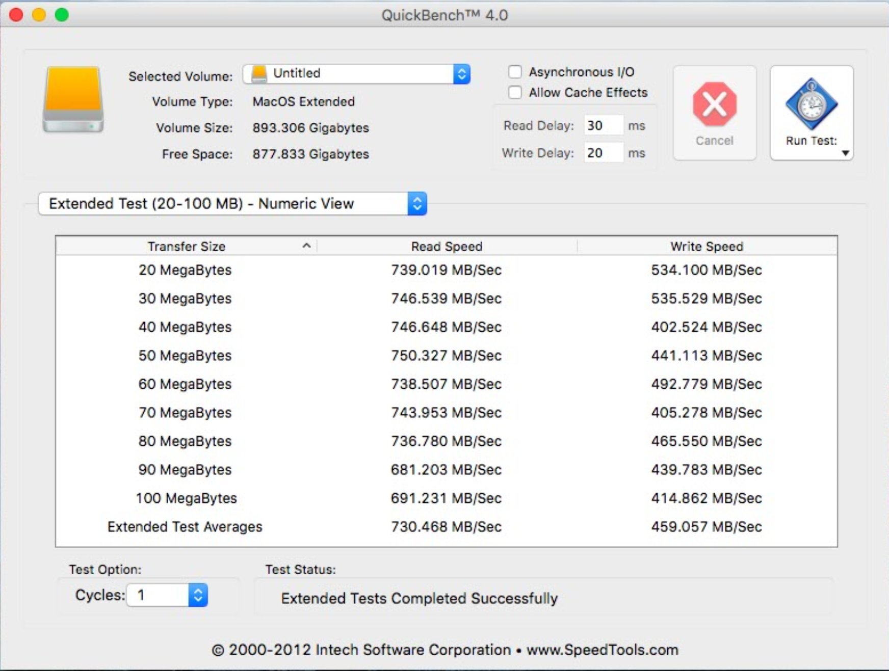 Our initial report on the Apple SSD we removed provides an excellent comparison reference to the below benchmarks. It is worthy of repeating that there is a slight trade off of performance between the two where four times the storage capacity is gained for slightly lower performance. The three tests below consist of Disk Speed Test, QuickBench and ZoneBench and are laid out just as in the initial report linked above.