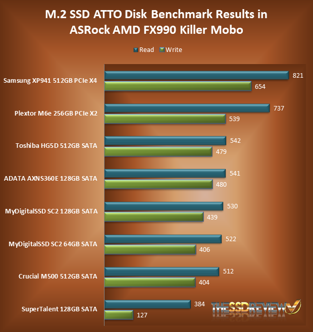 We would like to identify whether AMD also affects PCIe performance in some way but but there really isn’t enough data just yet. The only true sample we can look at is the Plextor/Lite-On M6e 256GB PCIe X2 M.2 SSD and it is not really a fair comparison as, last we tested it, it boot into its own BIOS prior to testing, whereas now, it boot into the 990FX BIOS which surprised us. As well, performance is a bit less but this drive has undergone significant use prior. Although CDM results appear to be a bit lower, ATTO results are still dead on.