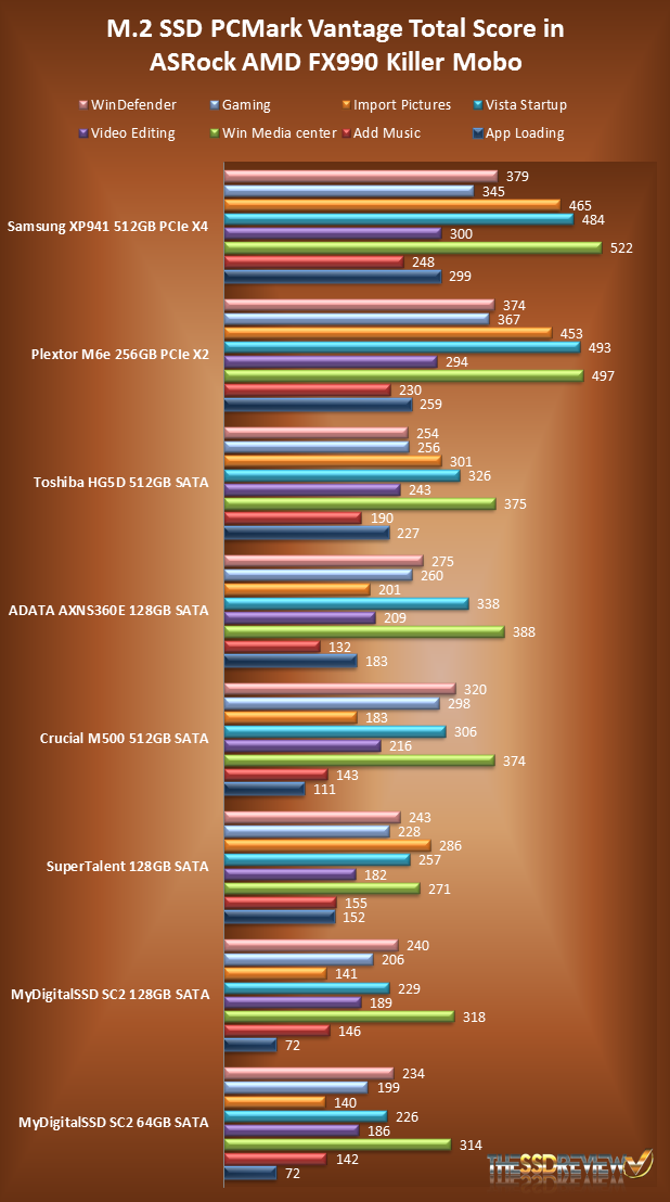 Our first chart provides the test results for each of the eith PCMark tests in MB/s, followed on the next page by the Total Score result.