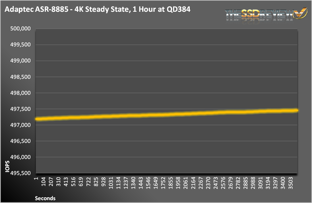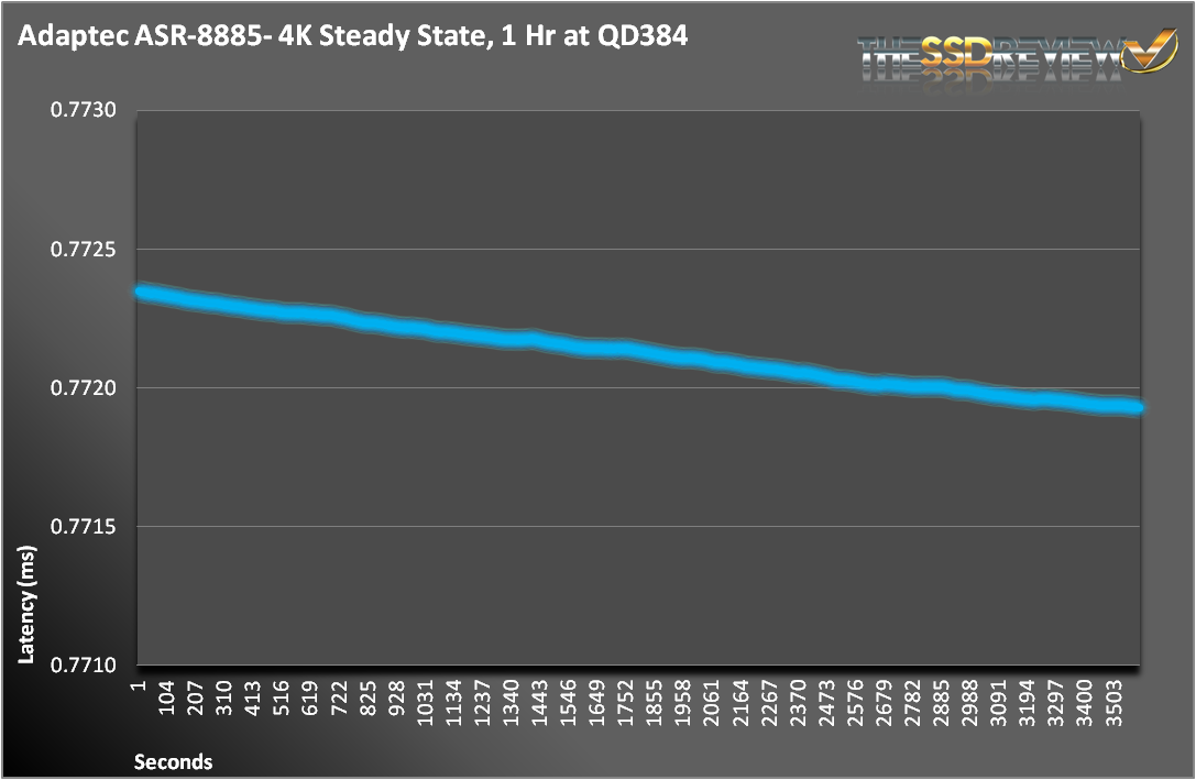 Wow. Even though there is a slope, look at the scale. Over the last hour, the results varied by less than 500 nanoseconds. This is by far the best consistency we have ever seen. Until we get a proper 12Gbps RAID solution from LSI, we won’t be able to tell who to heap the praise on, Adaptec or HGST. Until then, we will give the credit to both. Amazing performance.