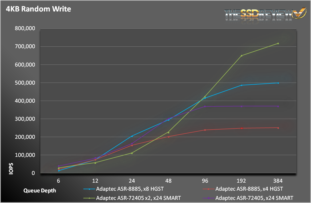 Random operations is where the superiority of the 12Gb solutions shows itself. In 4K writes, the Series 8 was 35% faster than the loaded Series 7. It was still no match to a pair of ASR-72405s, but 500K IOPS is still incredibly impressive.