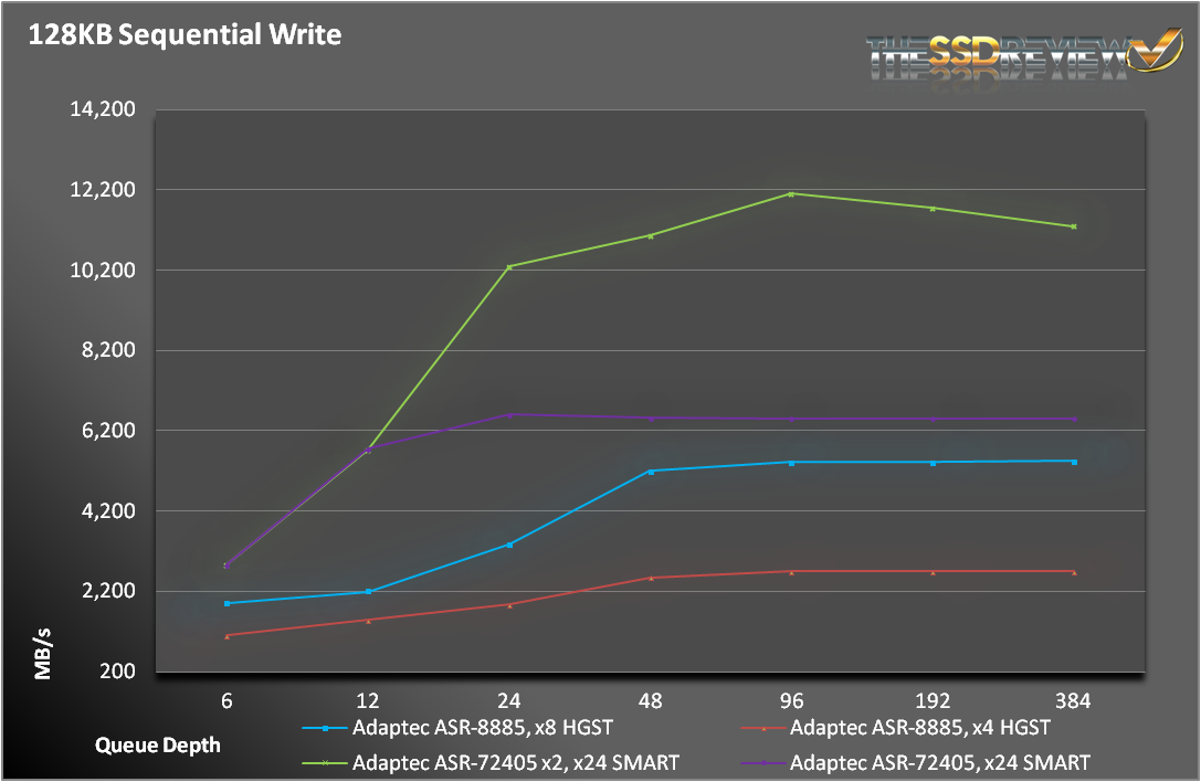For sequential writes, eight 12Gbps SSDs were just not enough to match the parallelism and raw power of 24 SMART Optimus SSDs. Even at nearly 700MB/s, the eight SSD800MMs were not quite enough to saturate the ASR-8885. We would have needed at least one or two more to clear 6GB/s.