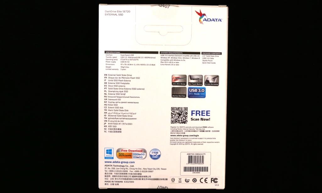 Included in the packaging is the SE720, a USB3.0 cable, instructions as well as a sheath for the drive itself. Looking at the front, there is a small light on the bottom that is blue when SSD activity is present.