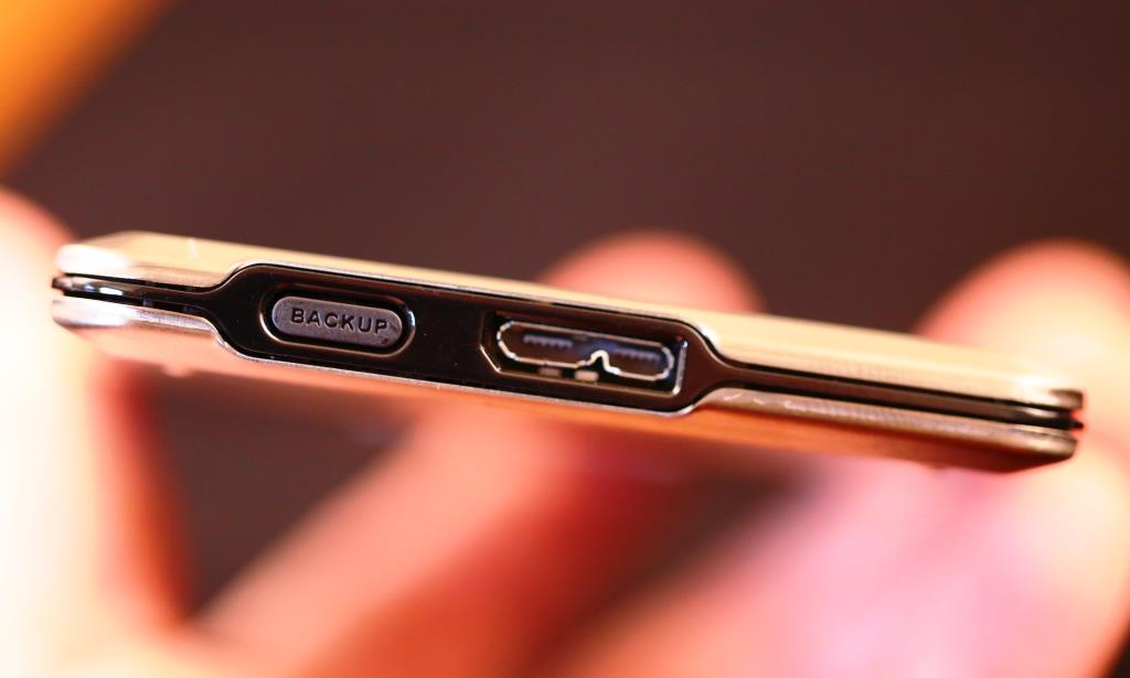 One might not realize just how thin the SE720 is until we look at the bottom ports. It is only 8.9 mm thick, has a backup button as well as a USB3 SuperSpeed port. Data backup is quick and easy once software is installed and the data directory listed. One can either press the backup button, or if you want to leave this connected to your PC, you can set scheduled backups automatically.