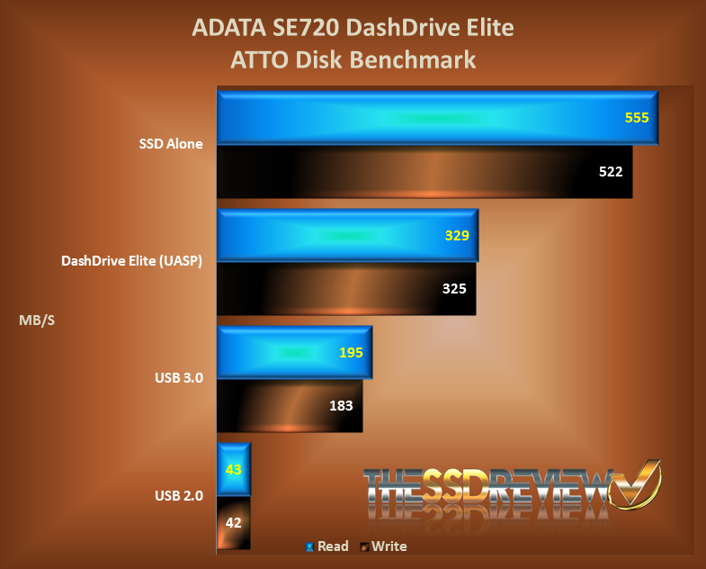 For our testing today, not only are we fortunate to be able to disassemble the ADATA DaskDrive Elite and completely remove the SSD, but also, we have both USB to SATA connectors for both USB 2 and USB 3 on hand. This means that we are able to test the SSD in USB 2, USB 3, USB 3.0 SuperSpeed (device standard), and also test the internal SSD itself. As well, we are using ATTO Disk BenchMark, Crystal DiskMark (oFill) and AS SSD which means that we are testing the SE720 which means we are testing the SE720 with both compressible and incompressible data samples. For all tests, we will be concentrating on ONLY the high sequential read and write performance as a mode of comparison.