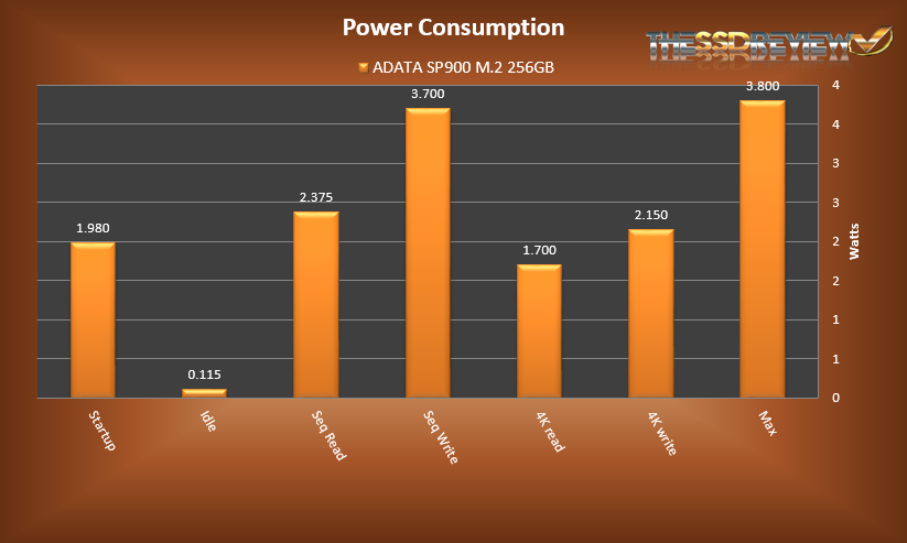 When it comes to power consumption, the SP900 M.2 performs decently. It is rated for a max of 6W active and 0.3W during idle. In our testing we found the drive stayed well within these boundaries. Idle consumption came in at a low 0.115W and the max consumption we seen was 3.8W. 4K read and write consumption is about average with what we have seen with other devices at 1.7W during 4K reads and 2.15W during 4K writes.