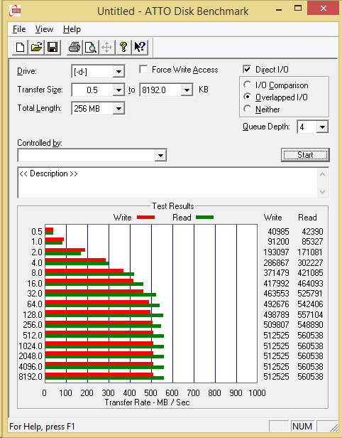 Our first look at performance is a positive one, with ATTO showing up to 560MB/s read and 512MB/s write speeds. The performance improvement from small to large file sizes is very solid.