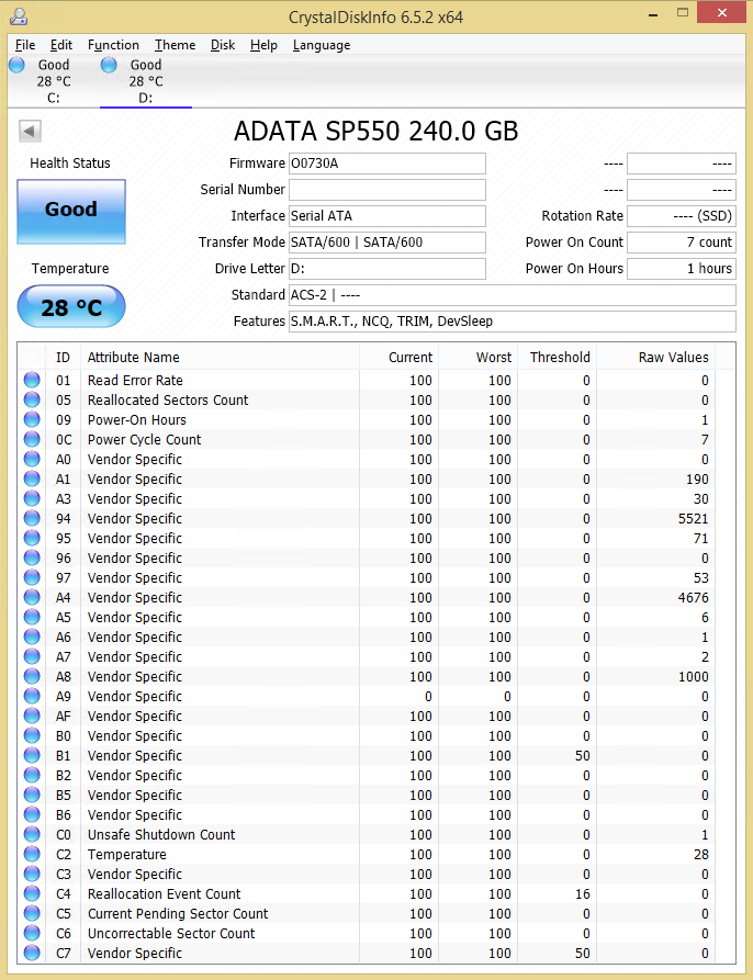 Crystal Disk Info shows us that on top of TRIM and NCQ, the Premier SP550 also supports DevSleep. There is also a working temperature sensor and a bunch of other helpful S.M.A.R.T. attributes.
