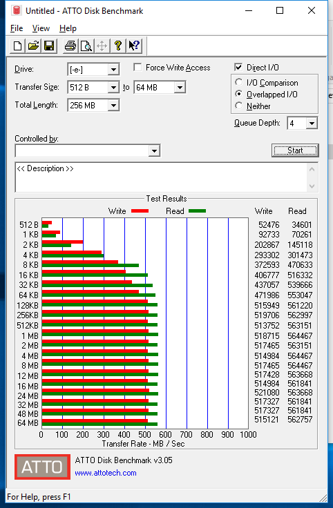 ATTO Disk Benchmark is perhaps one of the oldest benchmarks going and is definitely the main staple for manufacturer performance specifications. ATTO uses RAW or compressible data and, for our benchmarks, we use a set length of 256mb and test both the read and write performance of various transfer sizes ranging from 0.5 to 8192kb. Manufacturers prefer this method of testing as it deals with raw (compressible) data rather than random (includes incompressible data) which, although more realistic, results in lower performance results.
