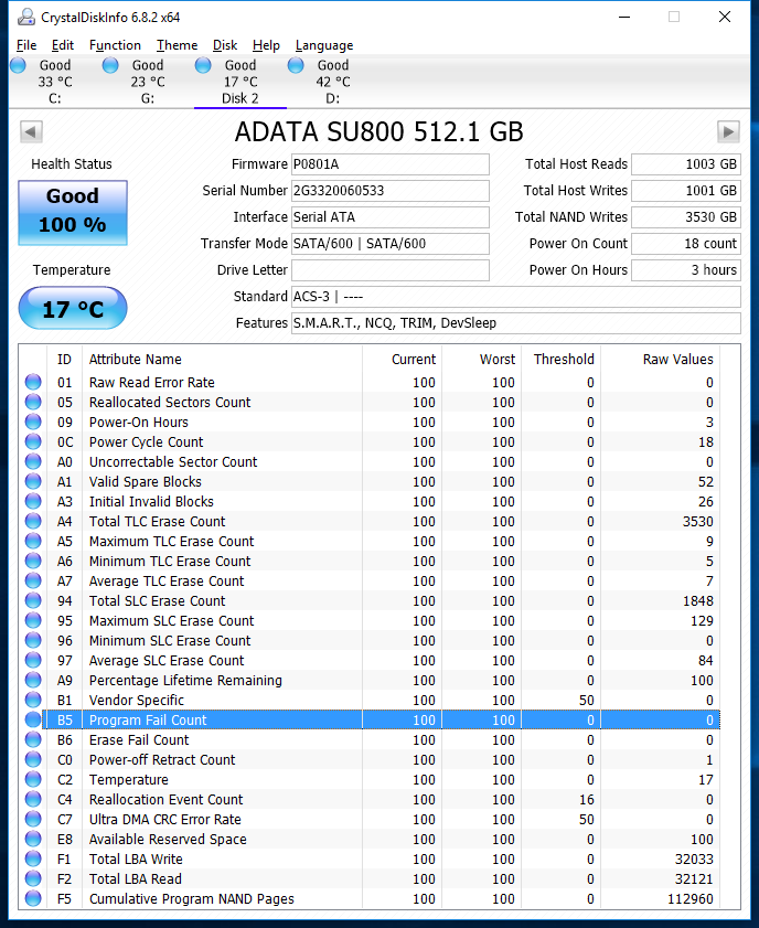 Crystal Disk Info shows us that a bunch of useful SMART attributes are presented to the end user. Total reads and writes as well as NAND writes are shown. TRIM, NCQ, and DevSleep are shown to be supported as well. The firmware version we are testing with today is version P0801A.