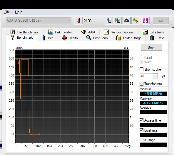 Next up, during our real world 30GB file transfer and power testing, the ADATA Ultimate SU800 did very well again. It averaged 530MB/s write and placed very high in our efficiency chart. At idle it consumed very little power, at just 53mW as well. Then finally, during a quick go at HDTune the SU800’s performance was nearly 500GB write across the whole span in the quick test. In order to see what the base write performance truly was we went ahead and ran the full write test on the drive and it showed an average of 50MB/s write, which explains the slow speed in PCMark 8 extended. But, this drop off came to light after 60GB of writes or so, which is very impressive for a TLC SSD utilizing a write cache. Thus, we really can’t take away many points for this as in a real-world use case it performs more than adequately and competes well within its target market.