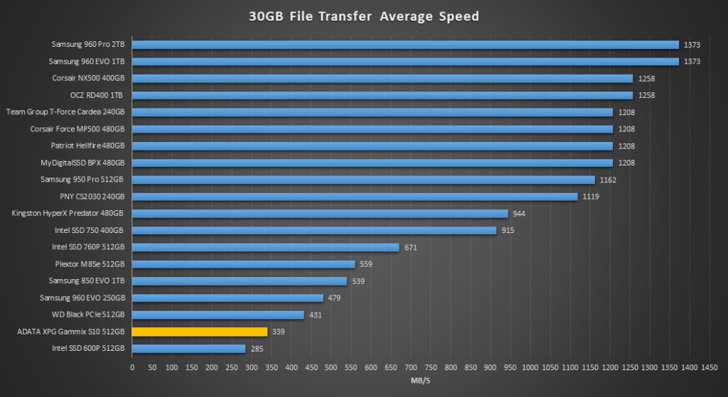 Like we saw during our PCMark 8 runs, the ADATA XPG Gammix S10’s faster write performance helps it to outshine the Intel 600P. With an average transfer speed of 339MB/s, however, it ranks second to last in our comparison and is even beat out by SATA based SSDs.