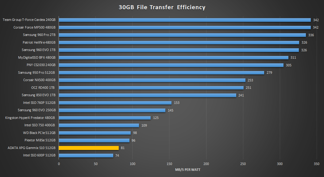 The chart above shows us just how efficient an SSD is in writing data. Here we can see that the Gammix S10 averages 81MB/s per watt. This result is just barely better than the Intel 600P and is less efficient than the SATA based Samsung 850 EVO 1TB.