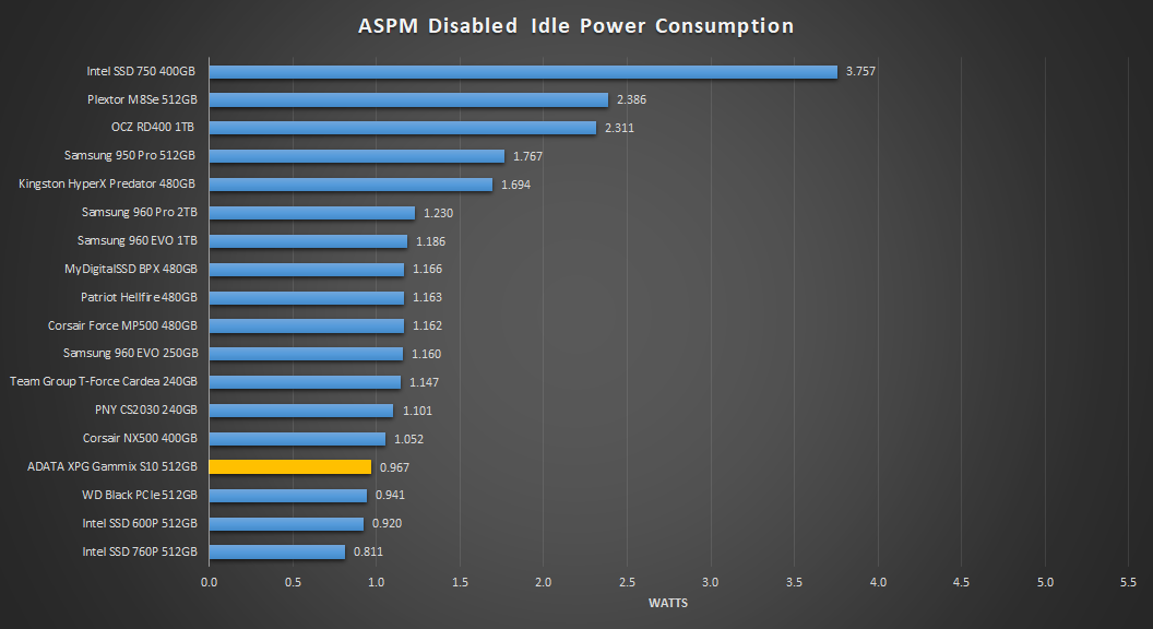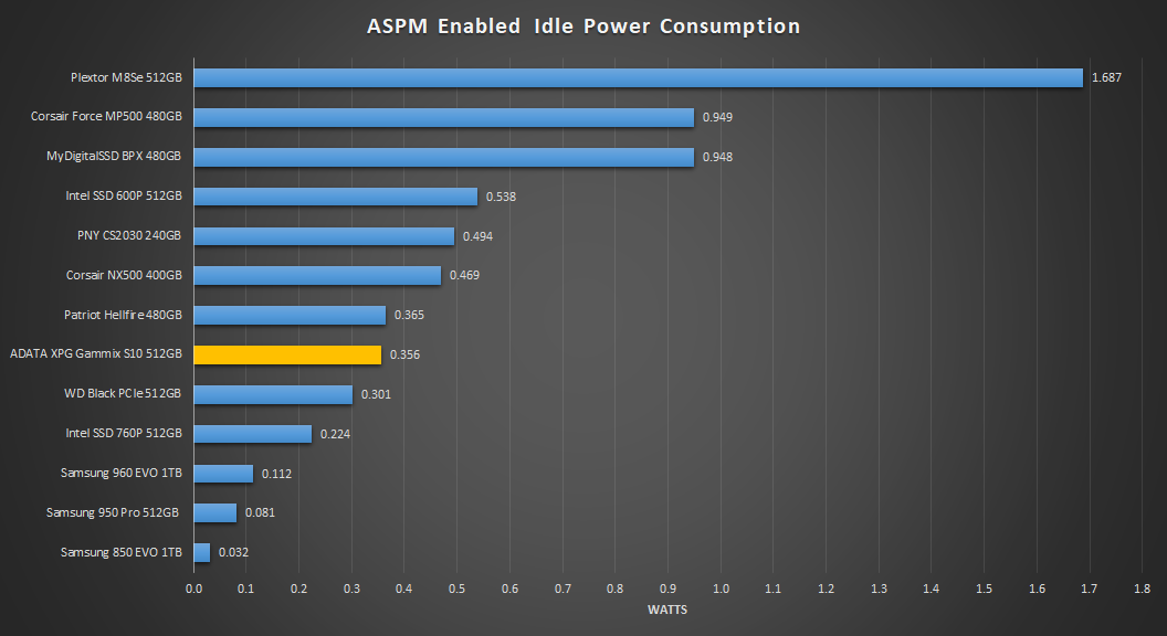 In the chart above, with ASPM enabled, we can see that the Gammix S10 consumes 1/3 of the power, sipping 0.356W at idle. This result is still fairly high, especially when considering most SATA SSDs consume less than 100mW at idle with ASPM enabled.