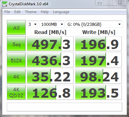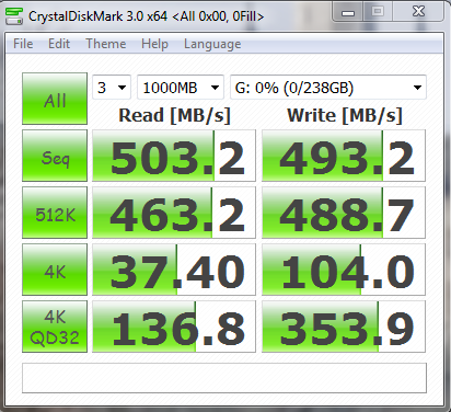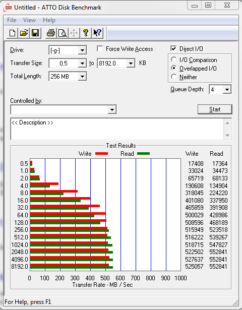 Initial performance results of 552MB/s read and 525MB/s write are excellent results for any mSATA SSD and right in line with manufacturers listed specifications.