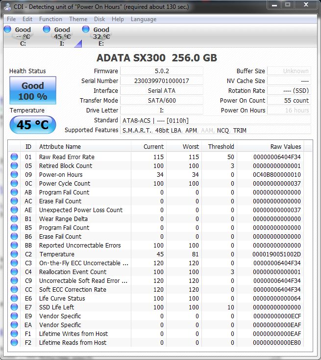 Crystal Disk Info provides some excellent information about the SSD itself to include its health, product information, power on information as well as the characteristics of the SSD. We can see that the ADATA SX300 SSD is capable of TRIM as it is not greyed out as with AAM.