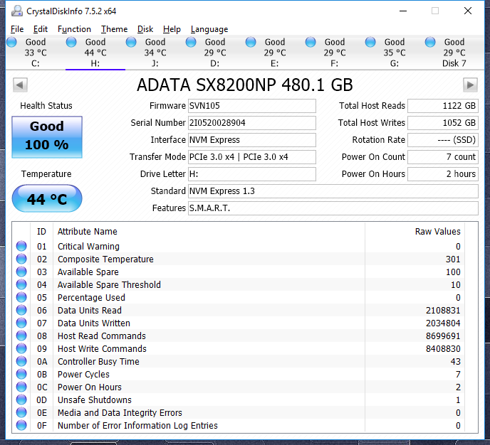 Crystal Disk Info is a great tool for displaying the characteristics and health of storage devices. It displays everything from temperatures, the number of hours the device has been powered, and even to the extent of informing you of the firmware of the device.