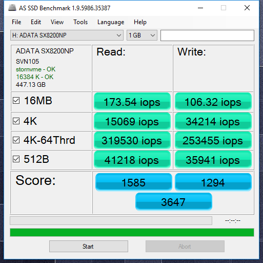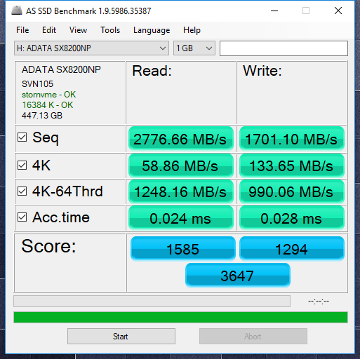 In AS SSD, the ADATA XPG SX8200 averaged a score of 3647 points. Performance comes in a little lower in this test, which is normal. Sequential performance reports as nearly 2.8GB/s read and 1.7GB/s write. 4K performance is very good again and the copy benchmark results are very fast.