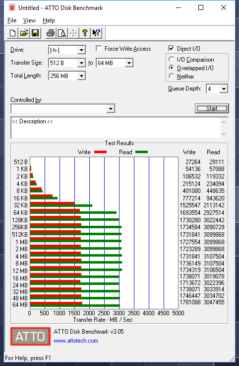 ATTO Disk Benchmark is perhaps one of the oldest benchmarks going and is definitely the main staple for manufacturer performance specifications. ATTO uses RAW or compressible data and, for our benchmarks, we use a set length of 256mb and test both the read and write performance of various transfer sizes ranging from 0.5 to 8192kb. Manufacturers prefer this method of testing as it deals with raw (compressible) data rather than random (includes incompressible data) which, although more realistic, results in lower performance results.