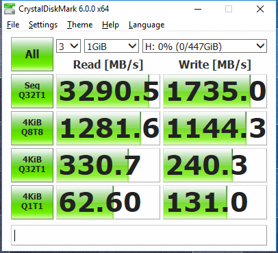 Unlike the norm, Crystal Disk Mark shows us even better results than ATTO. Nearly 3.3GB/s read and over 1.7GB/s write. 4K QD 1 performance is also revealed to be very good in reads, reaching 62MB/s. 4K writes are respectable given that our systems now have the meltdown/spectre patches. Otherwise, we would have seen over 200MB/s here.