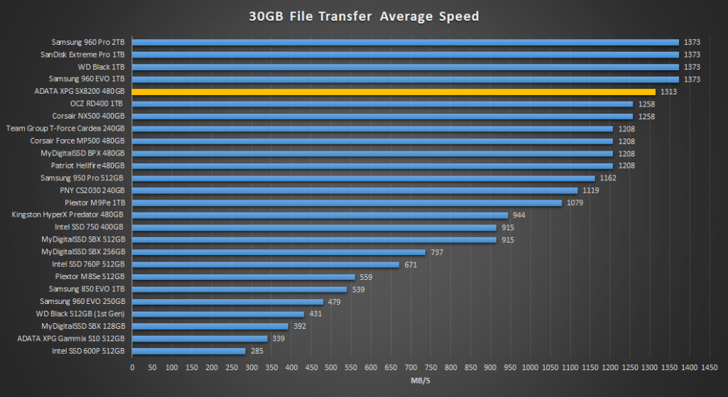 The ADATA XPG SX8200 delivered a very respectable result of 1313MB/s here. Unlike most other TLC based SSDs, the XPG SX8200 with Micron 2nd Gen 3D TLC seems to do very well with media files.