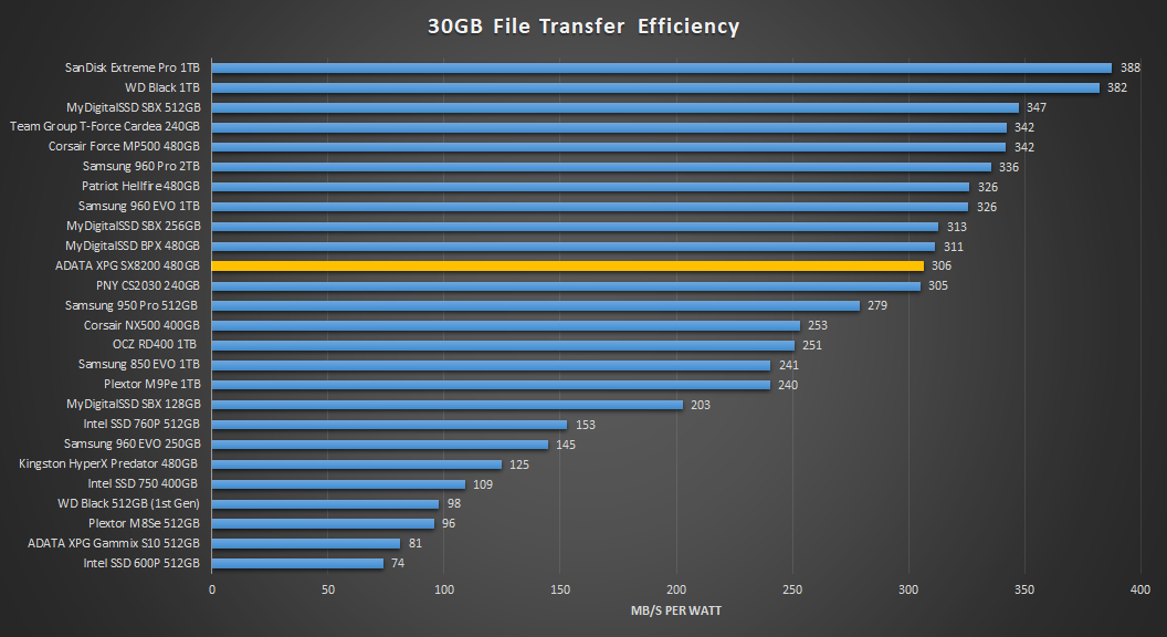 The chart above shows us just how efficient an SSD is in writing data. Here we can see that the XPG SX8200 is fairly efficient. It averages just over 300MB/s per watt, which is a huge improvement over ADATA’s XPG Gammix S10 which averaged only 81MB/s per watt.
