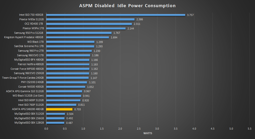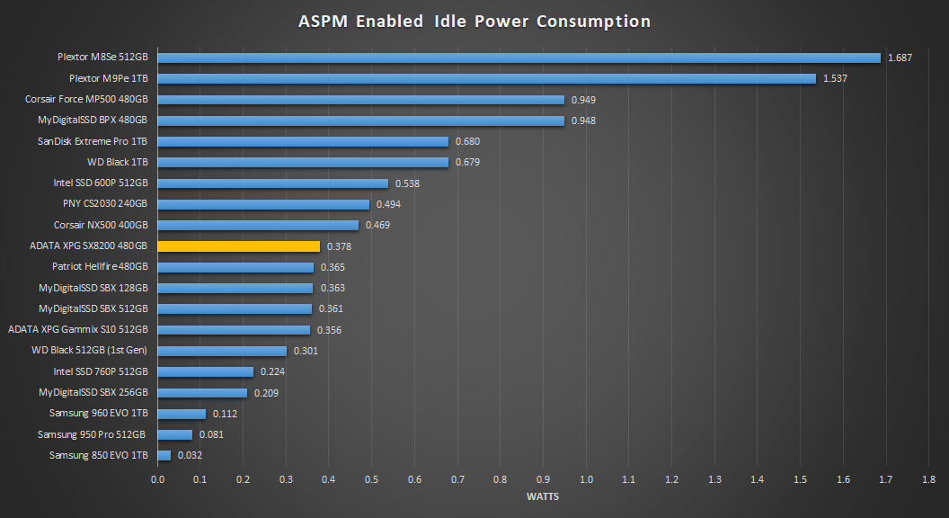 In the chart above, with ASPM enabled, we can see that it consumes about half as much power as when ASPM is disabled, just 0.378W.
