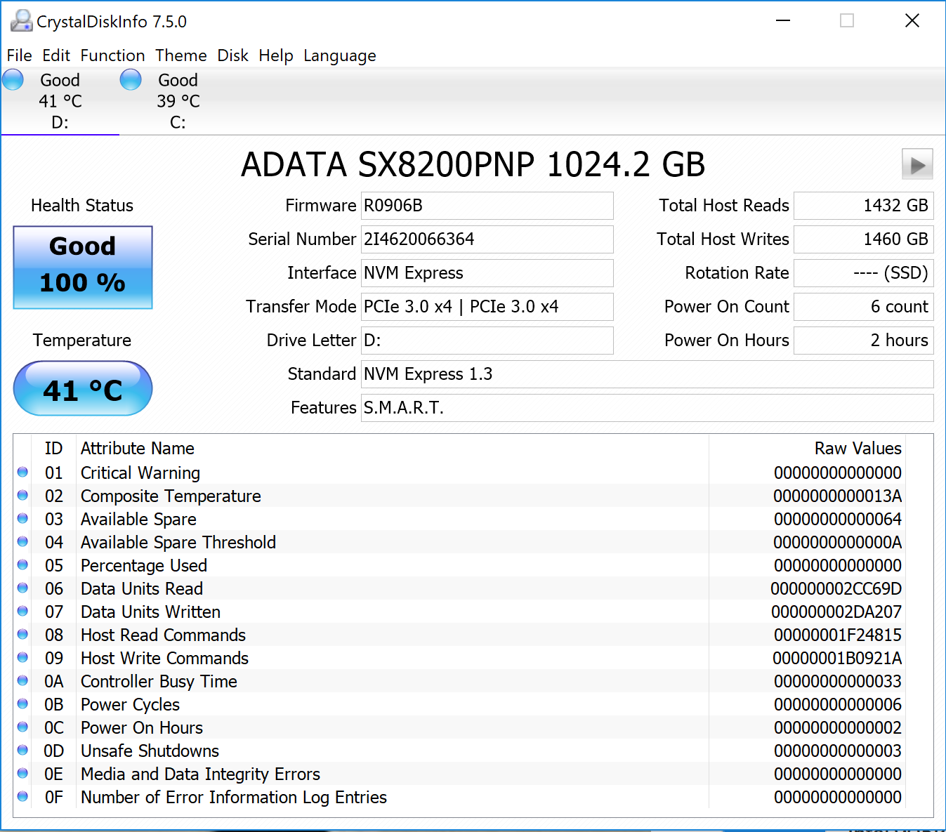 Crystal Disk Info is a great tool for displaying the characteristics and health of storage devices. It displays everything from temperatures, the number of hours the device has been powered, and even to the extent of informing you of the firmware of the device.