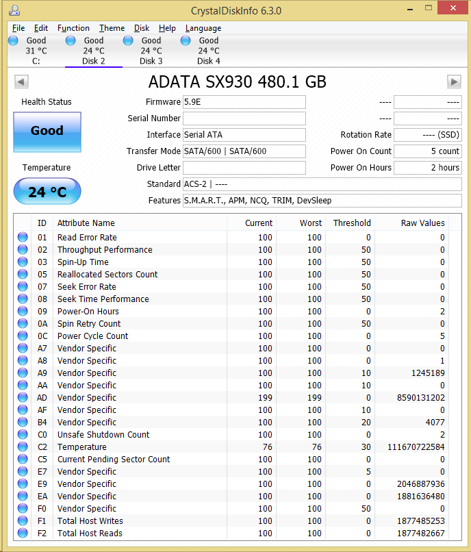 Crystal Disk Info shows us that on top of TRIM and NCQ, the XPG SX930 also supports DevSleep. There is also a working temperature sensor and a bunch of other helpful S.M.A.R.T. attributes.