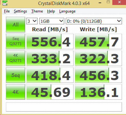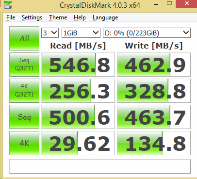 In Crystal Disk Mark the XPG SX930 was able to achieve slightly better peak sequential performance as well as 4K performance in the 120GB capacity. The larger capacity results are respectable, however, with both reaching over 540MB/s read and their rated write speeds.