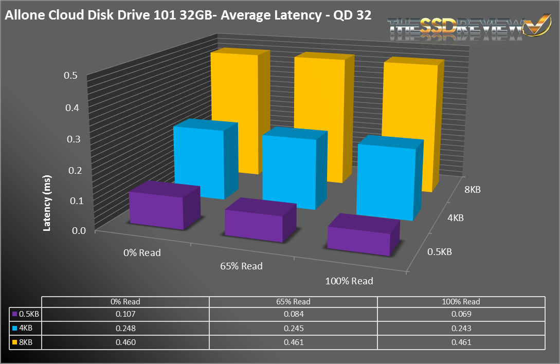 For average latency, the Cloud Disk Drive 101 gave us some really interesting results, especially the 4KB workload. As you can see, the results for read, write and mixed are almost identical. That is definitely not normal for an SSD, but for a DRAM based product with symmetrical r/w performance, it looks about right. The CDD 101 also excels at small block transfers. As you can see, the 512B performance is one of the highest we have ever seen.