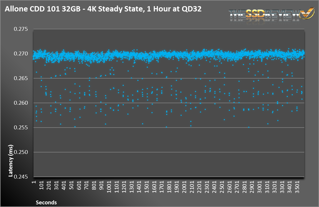 Here is the deal with the ALLONE Cloud Disk Drive 101; it behaves so unlike an SSD that many of our long-term tests are unnecessary. For a NAND-based SSD, we spend countless hours coaxing them into steady-state. Because the CDD 101 does not have NAND and doesn’t have to worry about P/E cycles, there aren’t different performance states, just steady-state. That is a major benefit of this product is that whether you are 1 second or several days into a run, the performance is identical.