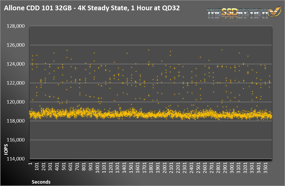 Since we normally run our SSDs with a 4KB workload, the ALLONE does not show its 470,000 IOPS that it can do at 512B. But, what we did see was a very respectable 118,000 IOPS. The performance was also very consistent, with just a few data points in the 120,000 IOPS region.