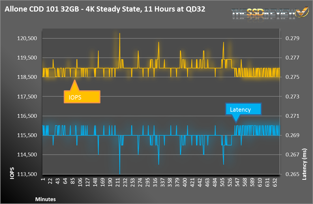 As we talked about in our Micron P400m SSD Review, SSDs have different performance states. Since the ALLONE Cloud Disk Drive 101 is an enterprise storage device, we will focus on steady state performance. With the following tests, we stressed the drive using random 4KB write workloads across the entire span for at least 24 hours. This is more than enough to achieve steady state. The following graph is showing the latency and IOPS across an 11 hour span.