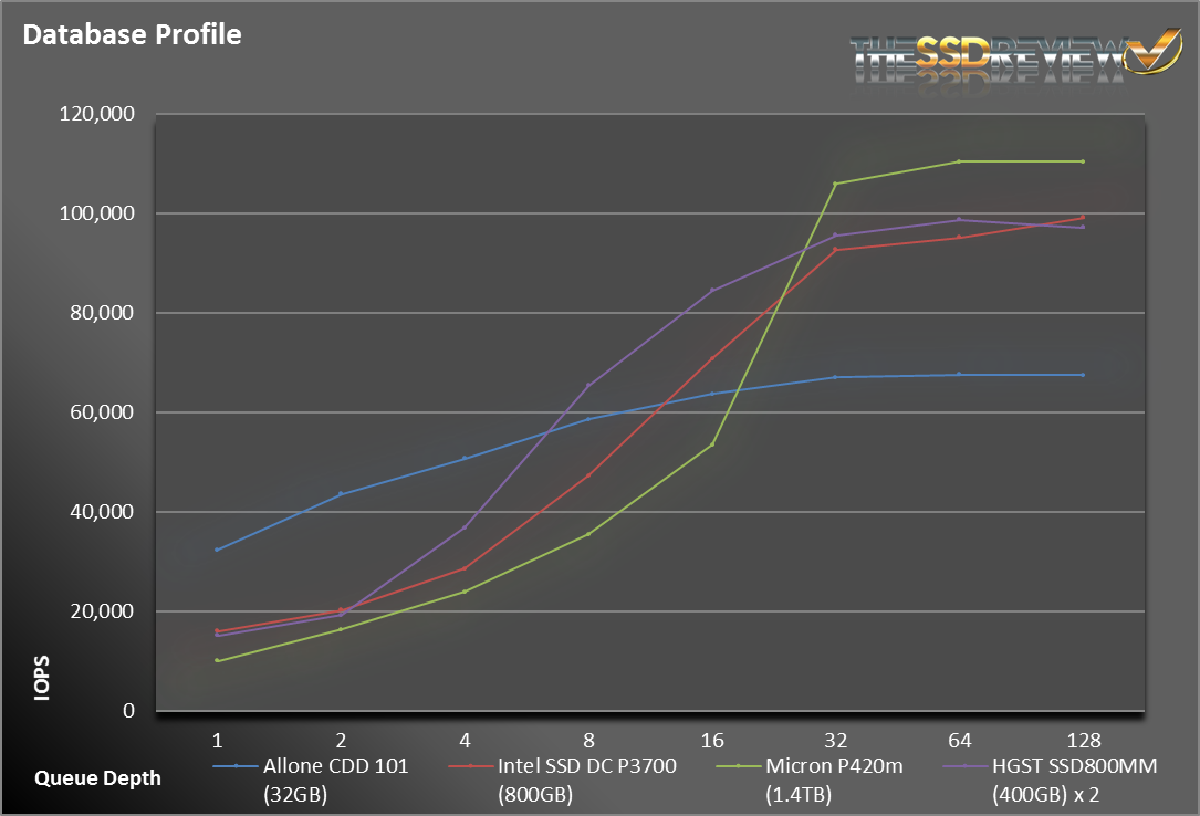 At low queue depths, the ALLONE does a terrific job running our database profile. Unfortunately, the superior high queue depth read performance allows the competition to pull ahead at the end.