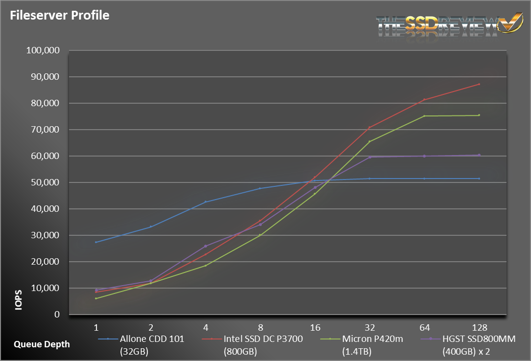 Not much changed in our fileserver testing. The ALLONE came out strong in the low queue depths, but didn’t have the read performance to maintain it.