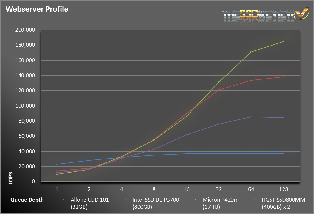 The webserver profile is similar to the fileserver profile, but has some additional 128K and 512K accesses thrown in for good measure. Additionally, the profile is 100% read.