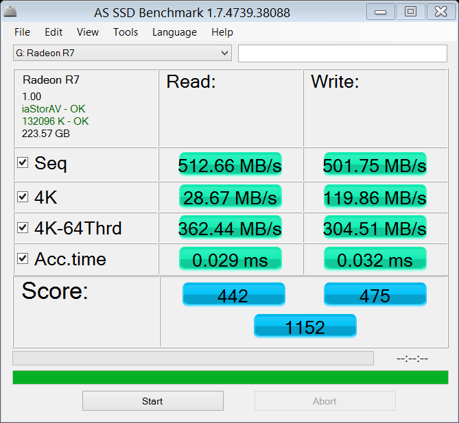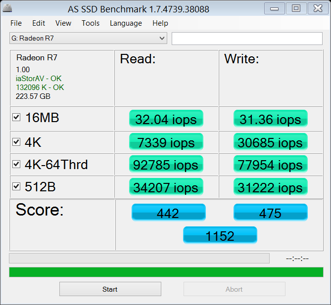 Looking at the result on the right, we get our first glance at IOPS of 92K read and 77K write. AS well, great access times contribute to a Total Score of 1152 and it is always great to see todays products exceed that 1000 point mark.