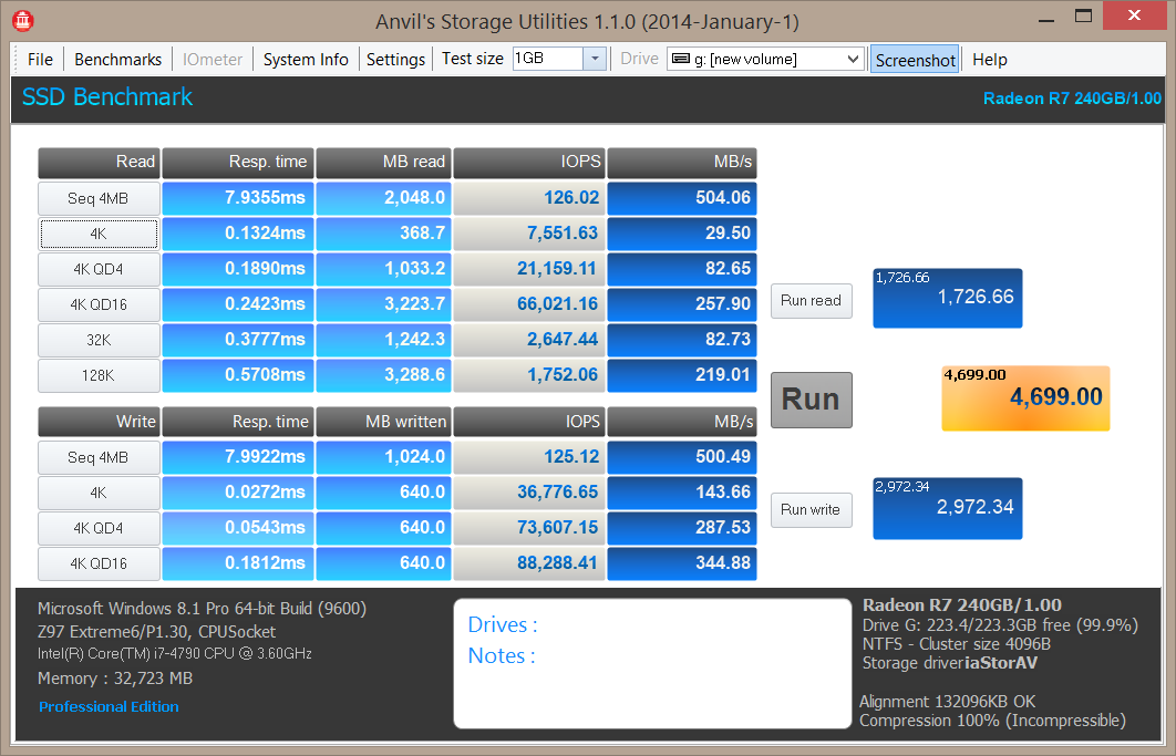 Anvil Storage Utilities (ASU) are the most complete test bed available for the solid state drive today. The benchmark displays test results for, not only throughput but also, IOPS and Disk Access Times. Not only does it have a preset SSD benchmark, but also, it has included such things as endurance testing and threaded I/O read, write and mixed tests, all of which are very simple to understand and use in our benchmark testing.