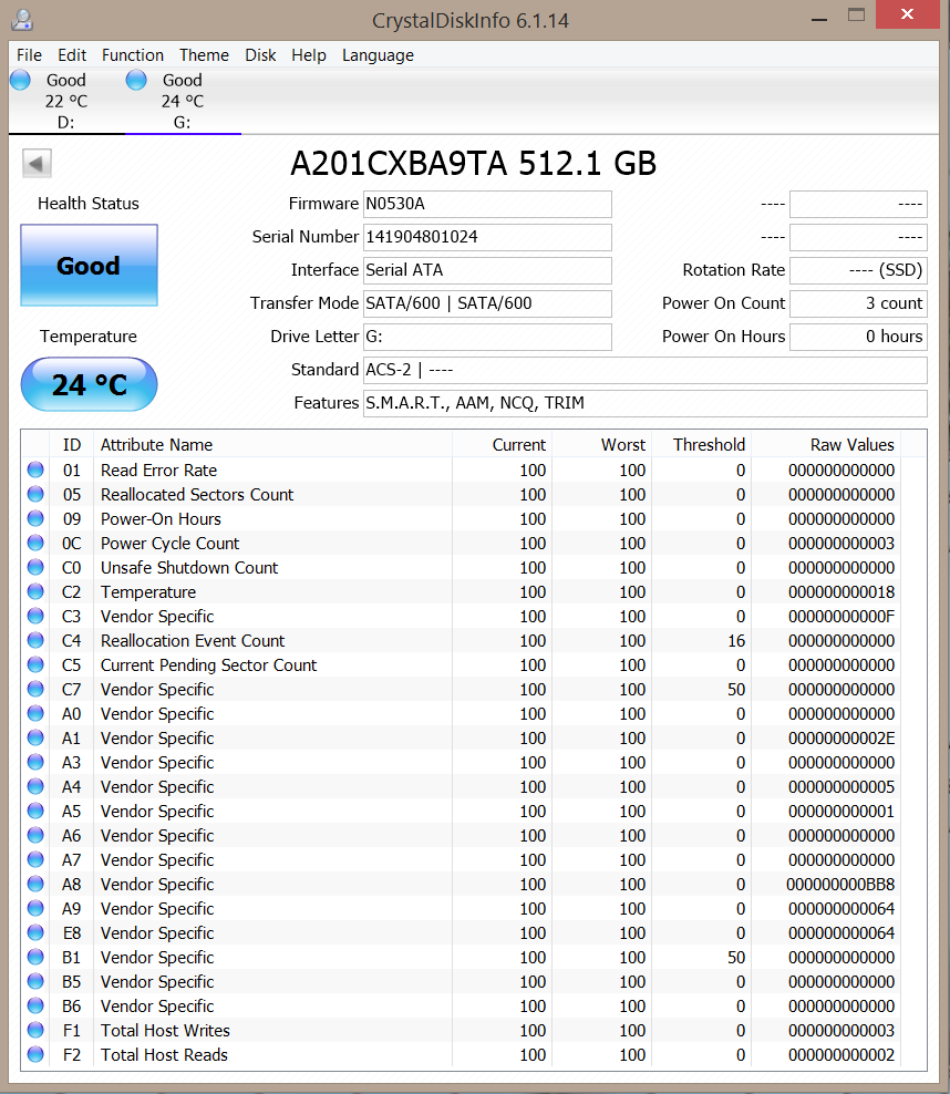 Crystal Disk Info is a great tool for displaying the characteristics and health of storage devices. It displays everything from temperatures, to the number of hours the device has been powered, and even to the extent of informing you of the firmware of the device.