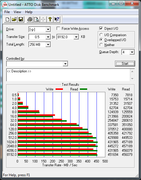 After initial results from ATTO, I must say I’m impressed. This drive is only rated for up to 390MB/s write, however, in this benchmark we are seeing just over 450MB/s for both read and write!