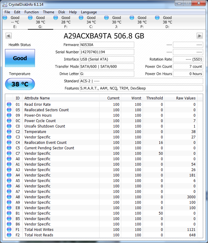 Crystal Disk Info is a great tool for displaying the characteristics and health of storage devices. It displays everything from temperatures, to the number of hours the device has been powered, and even to the extent of informing you of the firmware of the device.