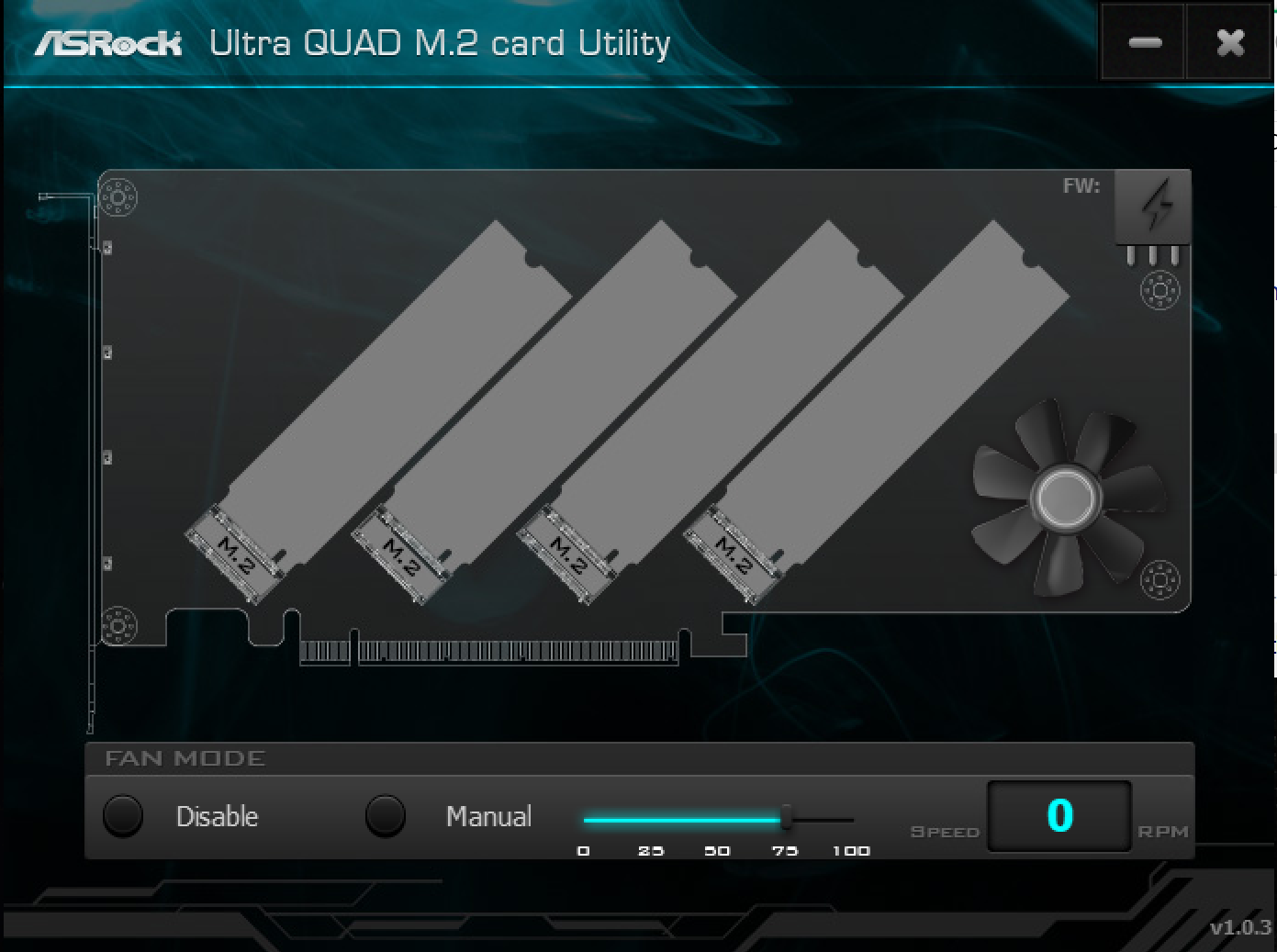 The exterior casing is aluminum and doubles as a heatsink and, for our testing today, we chose to run with four Samsung 960 Pro NVMe SSDs. In this photo above, we can understand how the SSDs are seated against the thermal padding which dissipates the heat to the outside of the device. There is also a 50mm fan and switch just above it to its left which allows the fan to run at full or half speed. The speed of the fan can also be controlled by the ASRock Ultra Quad Utility software. Next up, ASRock has included a 12v power port which connects perfectly to your unused second PCIe dual 6-pin connector. This accommodates for any additional power needed through the SSDs or fan.